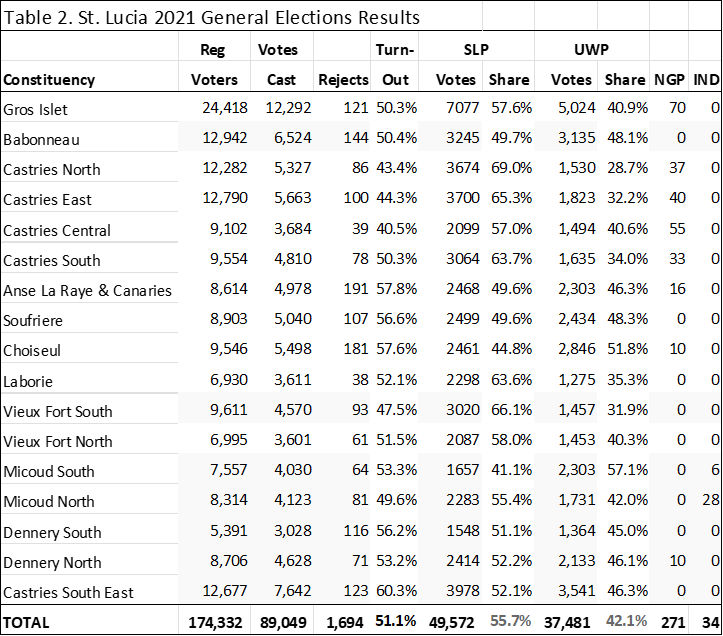 SLP fared better in this election, both in terms of seats and slice of votes. Its share of votes increased by nearly 6 percentage points, from 55.7% to 61.6%, while UWP’s share decreased by 6.5 percentage points, from 42.1% to 35.6%.