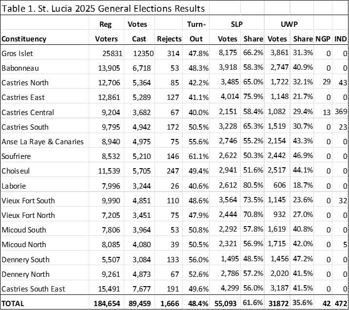 However, voter turnout was down by 2.6 percentage points, from 51.1% in 2021 to 48.4% in 2025. Laborie, followed by Castries, registered the lowest voter turnouts.